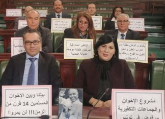 المنبر التونسي(الدستوري الحر) - قام نواب كتلة الحزب الدستوري الحر خلال الجلسة العامة ليوم الخميس 5 مارس 2020، بوضع شعارات تندد بالتفكير والعنف اللفظي...