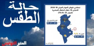 المنبر التونسي (توقعات الطقس) – يتميز طقس اليوم الأحد 18 جانفي 2026 بظهور سحب أحيانا كثيفة مع توقعات بنزول أمطار متفرقة